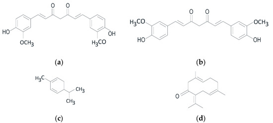 The anti-aging activity of four plants from the Zingiberaceae family (i.e., C. zedoaria, K. rotunda, C. longa, and C. heyneana) is attributed to bioactive compounds with chemical structures shown in Figure 9 below: curcumin (a), dihydrocurcumin (b), α-phellandrene (c), and germacrone (d). These bioactive compounds exhibit synergistic antioxidant and anti-aging activities [40].