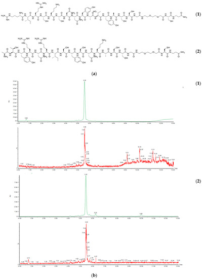(a) Sequence of the targeting peptide (PepC) (1) and of the scramble peptide (SCR) (2); (b) post-purification chromatograms of PepC (1) and SCR (2).