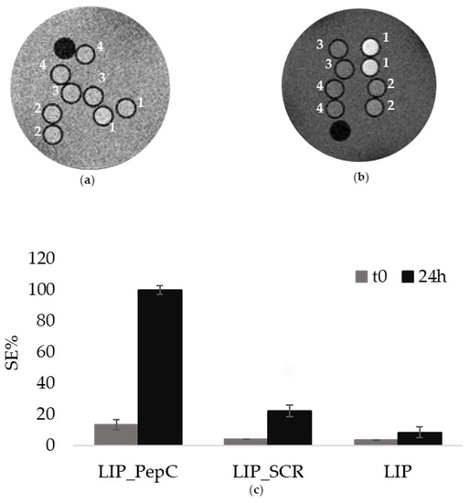 (a) MRI T1W of TS/A cells incubated with LIP_PepC (1), LIP_SCR (2), LIP (3), medium (4), and acquired on pellets obtained from the TS/A cells immediately after the addition of the liposomes to the cell culture. (t0); (b) MRI T1W of TS/A cells incubated with LIP_PepC (1), LIP_SCR (2), LIP (3), medium (4), and acquired after 24 h of incubation (24 h); (c) Histograms showing the SEs for Figure 2a,b.
