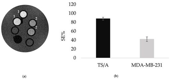 (a) MRI T1W of TS/A (1) and MDA-MB-231 (2) cells incubated with the same concentration of LIP_PepC and acquired after 24 h; (b) Histogram showing the SE referred to Figure 3a.