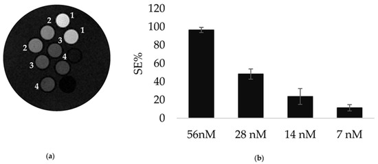 (a) MRI T1W of TS/A cells incubated with different concentrations of LIP_PepC: 56 nM (1), 28 nM (2), 14 nM (3), 7 nM (4); (b) histogram showing the SE for Figure 4a.