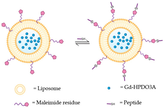 The strategy of the probe design consists of functionalizing the surface of paramagnetic liposomes, loaded with Gd-HPDO3A, with a maleimide group that can be used as an anchor point for the peptide molecular vector directed toward CAIX (Scheme 1). This type of bioconjugation was chosen because it requires mild conditions, such as room temperature and pH 6.5, to prevent biomolecule degradation.