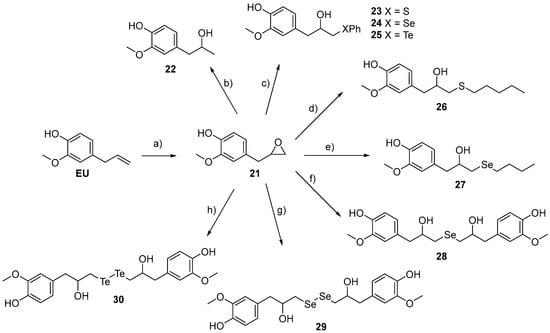 The obtainment of series C chalcogen-containing derivatives is reported in Scheme 3. Epoxide 21 was easily prepared upon the reaction of EU with 3-chloroperbenzoic acid (mCPBA) in CH2Cl2 at room temperature (r.t.) for 48 h [34]. The alcohol 22 was synthesized following a literature-reported route via reduction of 21 with LiAlH4 in tetrahydrofuran (THF) [35,36]. Epoxide 21 was, then, employed as the common key precursor for the synthesis of the series of chalcogen-containing EU derivatives 23–30. β-Phenylthio, β-phenylseleno, and β-phenyltelluro alcohols 23–25 were prepared via a ring-opening reaction of 21 with phenylchalcogenosylanes (PhSSiMe3, PhSeSiMe3, and PhTeSiMe3) under tetrabutylammonium fluoride (TBAF) catalysis [37]. The β-hydroxy sulfide 26 was obtained upon treatment of 21 with 1-pentanethiol in the presence of the Cs2CO3/tetrabutylammonium iodide (TBAI) system using DMF as a solvent [38]. Similarly, the β-hydroxy selenide 27 was synthesized through the ring-opening of 21 with butaneselenolate anions, easily generated in situ by reductive cleavage of dibutyl diselenide with NaBH4 in ethanol (EtOH) [39]. The bidentate selenide 28 was prepared through a related, on-water ring-opening procedure, using sodium selenide (Na2Se) as the nucleophilic species [40]. Na2Se was generated in situ from elemental selenium using rongalite (sodium hydroxymethanesulfinate dihydrate) as the reducing agent and H2O as the solvent. The synthesis of the diselenide 29 was pursued by exploiting the TBAF-catalyzed, silicon-mediated reaction of 21 with bis(trimethylsilyl)selenide [(Me3Si)2Se]. The ring-opening reaction of epoxide 21 also enabled the synthesis of β-hydroxy ditelluride 30 following our recently reported rongalite-mediated methodology [41]. All of the nucleophilic ring-opening reactions herein reported occurred with high regioselectivity, leading to the formation of the product as a result of the attack of the nucleophile onto the less hindered carbon atom of the epoxide 21. In the case of compounds 28–30, a mixture of diastereoisomers was achieved.