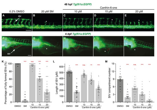 In an effort to identify novel anti-angiogenic compounds from our in-house library of 70 natural compounds isolated from plants and marine species and 137 semi-synthetic compounds [,], we took advantage of the Tg(fli1a:EGFP) transgenic zebrafish, where the blood vessels are fluorescently labelled []. The embryos were treated at 16 hpf, just prior to primary sprouting of ISVs [], to examine the effect of the test compounds on ISV development. An initial concentration of 20 µM was chosen as a starting concentration as this was the concentration required for SM, a pan-VEGFR kinase inhibitor to completely inhibit ISV development in zebrafish (Figure 1B and Figure S1A–D) []. Overall, we identified 3 compounds from our library, including kaempferol, which had previously been shown to be anti-angiogenic [], that inhibited ISV development at 48 hpf (Figure S1E–L). Of these, canthin-6-one, an alkaloid isolated from a plant named Brucea javanica (L.) Merr [], was noted to have minimal developmental phenotypic defects such as body shortening and developmental delay, and therefore was chosen for further characterisation (Figure S1E’–G’). As the amount of isolated canthin-6-one was limited in our library, we purchased commercially available canthin-6-one for all subsequent experiments. We next sought to identify the optimal concentration required to confer this anti-angiogenic activity in zebrafish without inducing off-target effects. For this, we treated Tg(fli1a:EGFP) embryos with canthin-6-one at concentrations ranging from 10–40 µM. As previously shown, treatment with 20 µM SM reduced the number of fully formed ISVs as well as ISV length, when compared to embryos treated with 0.2% dimethyl sulfoxide (DMSO, Figure 1A,B,K,L) []. We observed that canthin-6-one attenuated ISV formation in a dose dependent manner, where the number of fully formed ISVs and ISV length was reduced in embryos treated with both 15 and 20 µM canthin-6-one but not for 10 µM (Figure 1A,C–E,K,L). Higher concentrations of canthin-6-one (30 and 40 µM) resulted in moderate to severe body length shortening and body curvature of embryos, and thus were not included in our analysis (Figure S1M–O’). To exclude the possibility that canthin-6-one only inhibits trunk vascular development, we investigated whether canthin-6-one inhibits the development of SIVs. For this, we treated the embryos with canthin-6-one at 24 hpf (after ISVs have sprouted and before SIV development [,]) and measured SIV development at 4 days post-fertilisation (dpf), by quantifying the number of vessel chambers within the SIV. As anticipated, treatment with 20 µM SM significantly reduced the number of SIV compartments when compared to 0.2% DMSO treated larvae (Figure 1F,G,M). We also noted that canthin-6-one inhibited the formation of SIVs in a dose dependent manner with reduction in the number of SIV vessel compartments observed at both 15 and 20 µM, while 10 µM did not significantly inhibit SIV development (Figure 1F,H–J,M). Collectively, we demonstrated that canthin-6-one at 20 µM is anti-angiogenic in developing zebrafish and this concentration was used for all subsequent experiments.