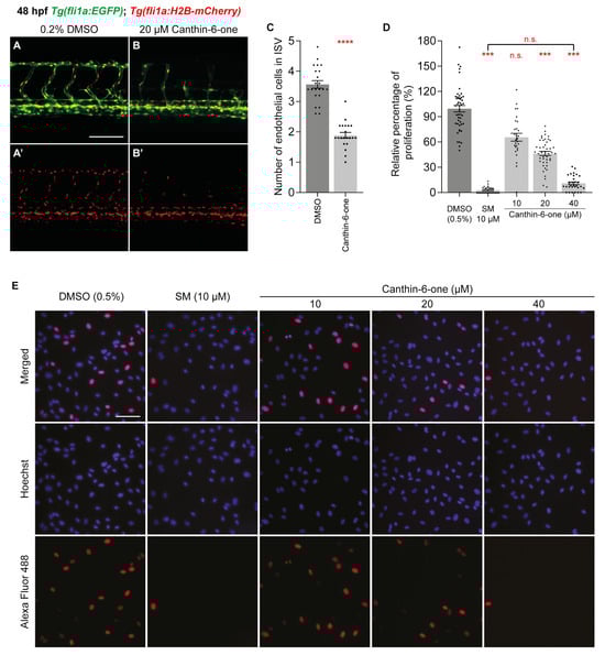 Canthin-6-one inhibits endothelial cell proliferation in zebrafish and HUVECs. (A,B’) Lateral confocal images of 48 hpf Tg(fli1a:EGFP);Tg(fli1a:H2B-mCherry) embryos treated with either 0.2% DMSO (A,A’) or 20 µM canthin-6-one (B,B’). Images (A’,B’) represent the fli1a:H2B-mCherry expression of images (A,B). (C) Quantification of intersegmental vessel (ISV) endothelial cell number in 48 hpf Tg(fli1a:EGFP);Tg(fli1a:H2B-mCherry) embryos treated with either 0.2% DMSO (n = 22 embryos) or 20 µM canthin-6-one (n = 21 embryos). Each data points represent an average of 5 ISVs from one embryo. (D) Quantification of relative percentage of proliferating HUVECs upon treatment with either 0.2% DMSO (n = 48 views), 10 µM sunitnib malate (SM, n = 30 views), or canthin-6-one at 10 µM (n = 28 views), 20 µM (n = 46 views), or 40 µM (n = 30 views). Results from at least 3 independent replicates. (E) Representative images of HUVECs treated with either 0.2% DMSO, 10 µM SM, or canthin-6-one at indicated concentrations. Cells were stained with Hoechst 33,342 (blue) and Alexa Fluor 488 (red) using the Click-iT assay. Blue indicates viable cells and red indicates proliferating cells. Statistical test: Mann-Whitney test for (C) and Kruskal-Wallis test for (D). p ≤ 0.0001 (****), p ≤ 0.001 (***), p > 0.05 (not significant, n.s.). Scale bars: 100 µm (A), 250 µm (E).