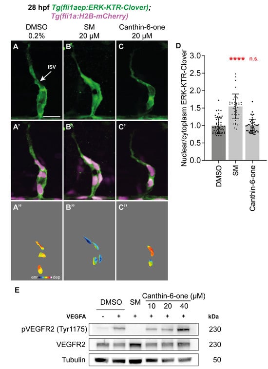 Canthin-6-one does not inhibit the VEGFA/VEGFR2 pathway. (A–C’’) Lateral spinning disc confocal images of intersegmental vessel (ISV) endothelial cells in 28 hpf Tg(fli1aep:ERK-KTR-Clover);Tg(fli1a:H2B-mCherry) embryos treated with either 0.2% DMSO (A,A’,A’’), 20 µM SM (B,B’,B’’), or 20 µM canthin-6-one (C,C’,C’’). Images (A–C) show fli1aep:ERK-KTR-Clover expression, while images (A’–C’) show both fli1aep:ERK-KTR-Clover and fli1a:H2B-mCherry expression. Images (A’’–C’’) show the nuclear fli1aep:ERK-KTR-Clover expression with intensity differences represented in 16 colour LUT (Fiji). The fli1a:H2B-mCherry signal was used to mark the nucleus. (D) Quantification of nucleus/cytoplasm ERK-KTR-Clover intensity in leading ISV endothelial cells of 28 hpf embryos treated with either 0.2% DMSO (n = 48 ISV endothelial cells from 10 embryos), 20 µM SM (n = 42 ISV endothelial cells from 10 embryos), or 20 µM canthin-6-one (n = 45 ISV endothelial cells from 12 embryos). (E) Western blot analysis of lysates isolated from HUVECs treated with either 0.2% DMSO, 10 µM sunitinib malate (SM), or canthin-6-one at indicated concentrations for 1 h and stimulated with vascular endothelial growth factor A (VEGFA) for 10 min (n = 3). Protein levels of pVEGFR2, total VEGFR2, or Tubulin were assessed. The full-length blots are presented in Figure S6. Statistical test: Kruskal-Wallis test was conducted for graph (E). p ≤ 0.0001 (****), p > 0.05 (not significant, n.s.). Scale bar: 50 µm (A).