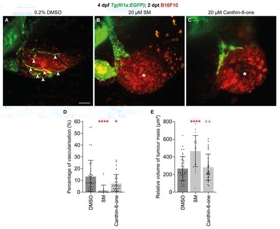 B16F10 xenotransplantation was performed as previously described []. Briefly, approximately 300–500 CM-DiI-labelled B16F10 cells were injected into the perivitelline space of 48 hpf Tg(fli1a:EGFP) embryos using a Eppendorf FemtoJet 4i (Merck, Dermstadt, Germany). Only embryos with visibly injected cells within the perivitelline space were selected for treatment. One hour after injection, embryos were treated with either 0.2% DMSO, 20 µM SM, or 20 µM canthin-6-one and incubated at 35 °C for 2 days before imaging. Graft vascularisation was quantified using previously described methods with modifications []. Briefly, volumes of the tumour mass (CM-DiI-stained, red) and blood vessels (EGFP-labelled, green) were measured using the Volocity image analysis software (version 5.4, Quorum Technologies, Sacramento, CA, USA) within the 3D area of interest encompassing the entire graft. The volume of graft vascularisation was divided by the graft volume to measure the percentage of graft vascularisation.