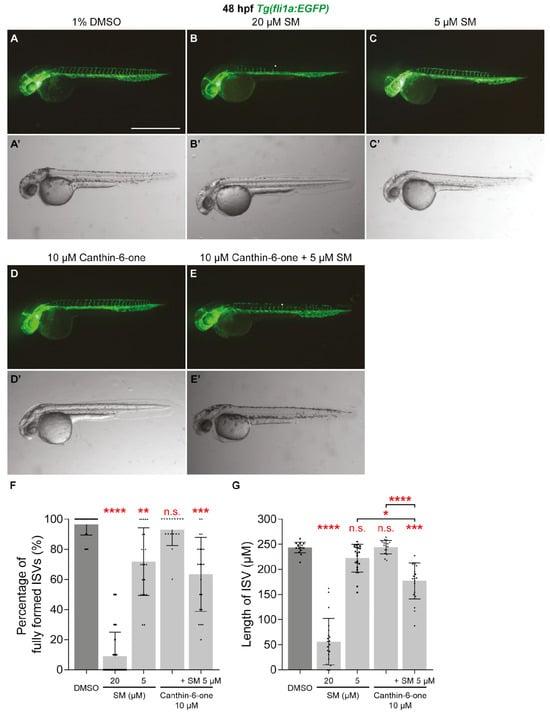 Co-treatment strategies, particularly with non VEGFR inhibitors have been suggested as a potential approach for overcoming resistance and toxicity of VEGFR inhibitors as cancer therapeutics []. To investigate whether canthin-6-one and VEGFR inhibitor SM synergise, we tested if co-treatment of canthin-6-one and SM at sub-optimal doses is able to impair ISV development. Unlike 20 µM SM, treatment with 5 µM SM at 16 hpf minimally reduced the number of fully formed ISVs and did not reduce ISV length at 48 hpf (Figure 5A–C’,F,G). Similarly, treatment with 10 µM canthin-6-one at 16 hpf did not inhibit ISV development (Figure 5D,D’,F,G). While we did not see any synergistic effect on the impairment of the number of fully formed ISVs, co-treatment of 5 µM SM and 10 µM canthin-6-one at 16 hpf significantly reduced ISV length at 48 hpf when compared embryos treated with 1% DMSO, or 5 µM SM or 10 µM canthin-6-one alone (Figure 5E–G). Collectively, our results showed that canthin-6-one is able to inhibit tumour-associated angiogenesis and synergises with VEGFR inhibitor SM.
