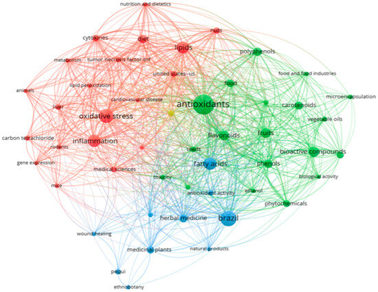 When associating pequi oil with inflammation using the search string described in Table S1, a total of 377 publications were retrieved from various databases (SCOPUS, BVS, CINAHL, Cochrane, Lilacs, Embase, ProQuest, PubMed, ScienceDirect, and Web of Science) up until January 2023. In terms of the references within these documents, Figure 1 illustrates the co-occurrence of terms (appearing at least 10 times, configured with ‘full count’) in their titles, keywords, and abstracts. The analysis presented in Figure 1 also provides insights into the most frequently co-occurring terms, which are represented by larger spheres. Notably, the academic community’s focus encompasses key topics such as oxidative stress, antioxidants, flavonoids, inflammation, fatty acids, and lipids.