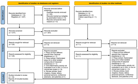 The following criteria were used to exclude articles from this systematic review: (i) pequi oil derived from species other than Caryocar brasiliense; (ii) fractionated pequi oil or other isolated compounds from Caryocar brasiliense; (iii) studies that did not evaluate anti-inflammatory activity in in vitro, in vivo, or clinical test models; and (iv) review articles, book chapters, theses, letters, personal opinions, conference abstracts, and patents.