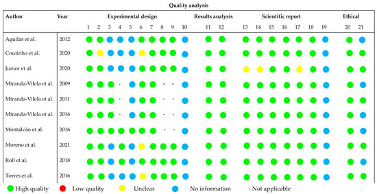 The quality analysis of the studies included in this review was conducted using the ARRIVE Guideline 2.0 [10], adapted to include 21 questions (see Table S3). These questions were independently answered by the pairs, with any disagreements resolved by a third reviewer. Responses of HIGH indicated high quality, LOW indicated low quality, UNCLEAR indicated that quality measurement was not possible, NO INFORMATION indicated that the information was not found in the article, and NOT APPLICABLE if the type of study does not apply to the question.