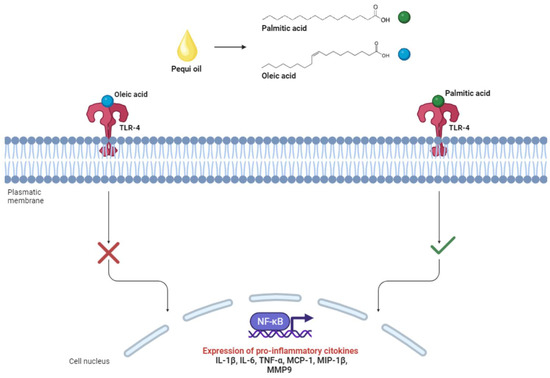 According to the chemical characterization results of the studies included in the present review, pequi oil is primarily composed of oleic acid (~55%) and palmitic acid (40%) [6,12,13,14,15,16,18,19,20]. Both fatty acids have paradoxical effects on the inflammatory response, with palmitic acid associated with pro-inflammatory effects and oleic acid with anti-inflammatory effects [67,68]. These associations result from the interaction of these fatty acids in the cellular signaling pathway mediated by toll-like receptors 4 (TLR-4). These receptors are expressed on the membrane of immune system cells and, when activated, stimulate the nuclear factor kappa B (NF-κB) to initiate gene transcription of several pro-inflammatory mediators such as IL-1β, IL-6, TNF-α, monocyte chemoattractant protein-1 (MCP-1), macrophage inflammatory protein 1β (MIP-1β), and matrix metallopeptidase 9 (MMP9) [67]. Saturated fatty acids like palmitic acid, when bound to TRL4, stimulate the signaling pathway, resulting in inflammation activation, while monounsaturated fatty acids like oleic acid inhibit it, as illustrated in Figure 4 [67,68].