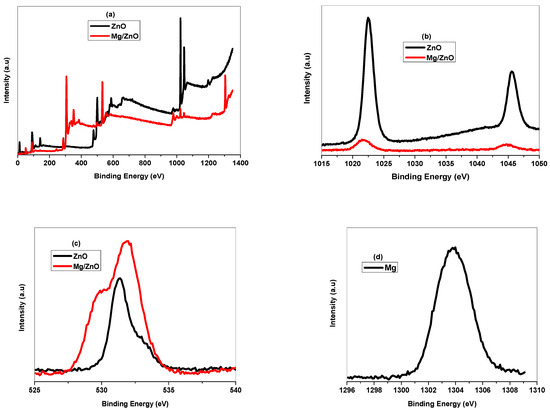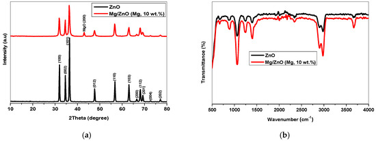 The molecular vibration, chemical bonding, and functional group of ZnO and Mg-doped ZnO NPs were investigated using FTIR spectra through a wavenumber range of 500–4000 cm−1. As demonstrated in Figure 1b, the FTIR spectra of the prepared samples have a similar behavior; however, the doped sample shows strong wide bands and high intensity.