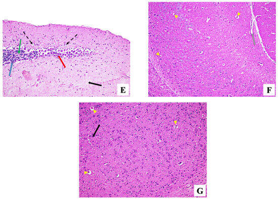 Figure 4. Microscopic histopathological representative images showing the histopathological changes in brain tissues of all groups in this study. (A) Healthy brain showing normal brain architecture (H&E ×100). (B) Histopathological changes in GII showing severe gliosis (yellow arrows) (H&E ×400). (C) Brain section of the infected untreated group showing brain edema (black arrow) and inflammatory cells (blue arrows) (H&E ×400). (D) Histopathological changes in GIII showing severe brain edema (black arrows), moderate gliosis (yellow arrows), and few inflammatory cells (blue arrow) (H&E ×200). (E) Brain section of GIII showing brain edema (black arrow), accumulation of red neurons (red arrow), degenerated neural cells (black dashed arrows), hemorrhage (green arrow), and inflammatory cells (blue arrow) (H&E ×200). (F) GIV group showing degenerated tissue cysts (yellow arrowheads) and dilated blood vessels (gray arrow) (H&E ×200). (G) GV group showing degenerated tissue cysts (yellow arrowheads) and mild brain edema (black arrow) (H&E ×200).