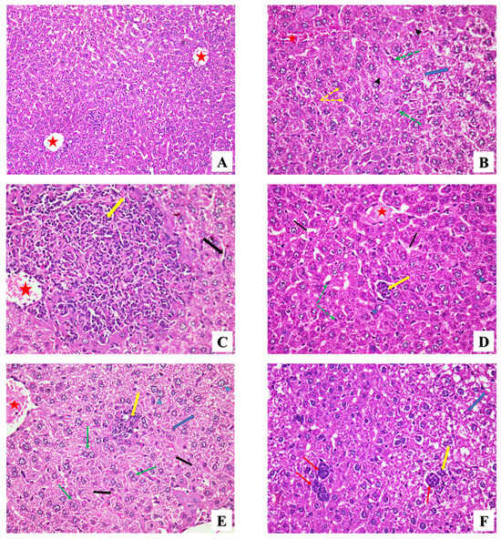 Figure 5. Microscopic histopathological representative images showing the histopathological changes in liver tissues of all groups in this study. (A) Normal health group (GI) showing uniform hepatocytes with eosinophilic cytoplasm around the central veins (red stars) and normal sinusoids (H&E ×400). (B) Liver sections of the infected untreated group (GII) showing hydropic degeneration (blue arrow), acidophilic cytoplasm (black arrowheads), pyknotic nuclei (green dashed arrows), karyorrhexis (yellow dashed arrows), and vascular congestion (red star) (H&E ×400). (C) Infected group showing severe periportal inflammatory cellular infiltration (yellow arrow), vascular congestion (red star), and sinusoidal dilation (black arrow) (H&E ×400). (D) Infected group treated with PYR+SDZ combination (GIII) showing ballooning of some hepatocytes (blue arrowheads), mononuclear inflammatory cells (yellow arrow), pyknotic nuclei (green dashed arrows), congestion of central vein (red star), and sinusoidal dilation (black arrows) (H&E ×400). (E) ZnO NP-treated group (GIV) showing hydropic degeneration (blue arrow), ballooning of some hepatocytes (blue arrowheads), binucleated hepatocytes (green arrows), lymphatic inflammatory cells (yellow arrow), congested central vein (red star), and sinusoidal dilation (black arrows) (H&E ×400). (F) Administration of Mg-doped ZnO NPs (GV) showing elongated and circular tissue cysts (red arrows) with some inflammatory cells (yellow arrow) and hydropic degeneration (blue arrow) (H&E ×400).