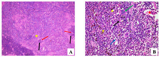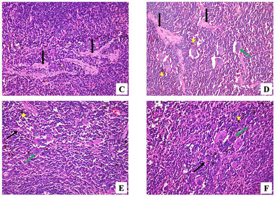 Figure 6. Microscopic histopathological representative images showing the histopathological changes in splenic tissues of all groups in this study. (A) Normal healthy group (GI) showing normal splenic tissue of red pulp (yellow star) and white pulp (black arrows) with follicular arteriole (red arrows) (H&E ×100). (B) Infected group (GII) demonstrating splenic architecture loss, macrophages infected by T. gondii (green arrow), plasma cells (blue arrow), extravasation of blood (black arrow) moderate deposition of hemosiderin pigment (yellow arrowheads), and congested blood vessels (red star) (H&E ×400). (C) Splenic section of infected group (GII) showing fibrinoid material in splenic trabeculae (black arrows) (H&E ×400). (D) Splenic section of GIII showing macrophages infected by T. gondii (green arrow), fibrinoid material (black arrows), and mild deposition of hemosiderin pigment (yellow arrowheads) (H&E ×400). (E) Splenic section of GIV showing macrophage (green arrow), mild deposition of hemosiderin pigment (yellow arrowhead), congested blood vessels (red star), and extravasation of blood (black arrow) (H&E ×400). (F) Splenic section of GV showing macrophage (green arrow), mild deposition of hemosiderin pigment (yellow arrowhead), and extravasation of blood (black arrow) (H&E ×400).
