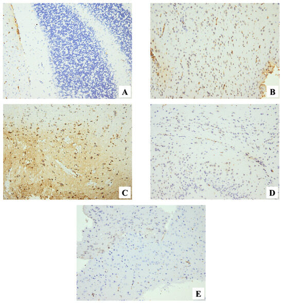 For IHC evaluation, the immunohistochemical biomarker P53 was used as an apoptotic indicator in the cerebral tissues of all groups in this experimental study. The healthy group showed no immunoreactivity (Figure 7A). In contrast, the cerebral sections of infected mice showed moderate P53 expression (Figure 7B). A substantial increase in P53 expression was observed in infected mice administered the PYR+SDZ combination (Figure 7C). On the other hand, GIV and GV groups showed a reduction in P53 expression (Figure 7D and Figure 7E, respectively). Contrary to the PYR+SDZ combination, ZnO and Mg-doped ZnO NPs showed reductions in the main immunohistochemical score, particularly Mg-doped ZnO NPs, significantly reducing the immunohistochemical score (Table 4). There is no a significant difference between ZnO- and Mg-doped ZnO NP-treated groups.