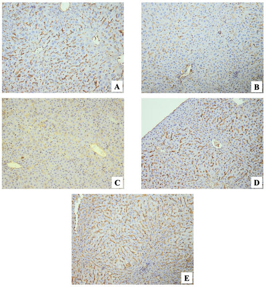 In addition, the immunohistochemical biomarker CD31 was used as an angiogenic indicator in the hepatic tissues of all groups in this experimental study. The healthy mice (GI) showed positive CD31 reactivity with liver tissue (Figure 8A). Liver sections of infected mice exhibited moderate CD31 expression (Figure 8B). In comparison to the CD31 level of healthy mice, infected mice administered the PYR+SDZ combination showed very mild expression (Figure 8C), while infected mice treated with ZnO and Mg-doped ZnO NPs showed strong expression (Figure 8D,E respectively) as GI and showed significant increases in the IHS, but without any significant difference between the two groups (Table 4).