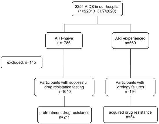We conducted a retrospective analysis of PDR and ADR in all PLWH at PLA General Hospital’s Fifth Medical Center from 1 March 2013 to 31 July 2020. The inclusion criteria for this study were as follows: (1) complete general information, (2) ART-naive or ART-experienced status prior to enrollment, and (3) agreement to undergo drug resistance testing. The study was approved by the Ethics Committee of the Fifth Medical Center of PLA General Hospital. Demographic information (gender, age) and epidemiological information (route of transmission, time of diagnosis, initiation of ART, current regimen) were collected retrospectively (Table 1). The plasma was separated within 6 h of blood collection and stored at −80 °C for subsequent use. A total of 1785 ART-naive individuals and 569 ART-experienced individuals were enrolled in this study. PDR analysis was performed on all ART-naive participants, while ADR analysis was conducted on those with ART duration exceeding 6 months (Figure 1).
