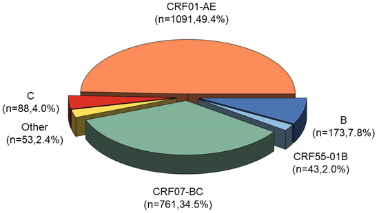 The distribution of genotypes in this study is presented in Figure 2. Among the 2209 participants, we identified a total of five major genotypes and several other genotypes. The circulating recombination forms (CRFs) CRF01-AE (49.4%, 1091/2209) and CRF07-BC (34.5%, 761/2209) were the most prevalent genotypes, followed by B (7.8%, 173/2209), C (4.0%, 88/2209), CRF5501-B (2.0%, 43/2209), and others (2.4%, 53/2209).