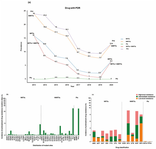 The prevalence of PDR was the highest for NNRTIs among the three types of antiretroviral drugs (Figure 3a). Among the mutation sites, 30.3% (64/211) were clustered on V179D, which was associated with potentially high-level resistance to NNRTIs. Mutations in V179D/E can lead to a 2–5 times reduction in susceptibility to drugs like NVP, EFV, ETR, and RPV [42]. Our study also observed similar results, with V179D causing high and intermediate levels of resistance to NVP and EFV and low-level resistance to RPV, EFV, NVP, and ETR. Although V179D/E mutations do not appear to significantly impact virologic response to first-line regimens, their high prevalence (3.9%, 64/1640) suggests caution in regimen selection. The HIV treatment guidelines recommend replacing the NNRTI with lopinavir/r (LPV/r) for second-line regimens. PIs mainly showed low-level resistance to NFV/r and TPV/r, consistent with previous studies [39], suggesting that PIs are viable options for second-line regimens following the baseline regimen. Based on our findings, the prevalence of PDR mutations in ART-naive individuals in Beijing was significantly higher for NNRTIs (87.2%, 184/211) than for NRTIs (35.5%, 75/211) and PIs (1.4%, 3/211), underscoring the importance of immediate PDR testing after diagnosis. According to the World Health Organization’s guidelines for updated public health response to PDR, countries with NNRTI PDR mutation rates exceeding 10% should consider changing their first-line ART regimens from NNRTIs to non-NNRTI drugs, including INSTIs. Therefore, our findings suggest that physicians should make informed decisions in selecting appropriate treatment regimens.