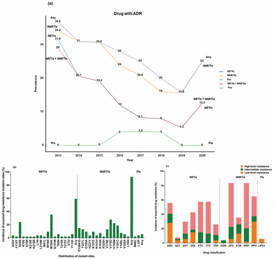 Among the 569 ART-experienced individuals, there were 194 participants who experienced virologic failure, and 54 of them (27.8%, 54/194) exhibited acquired resistance mutations. The prevalence of mutations resistant to NNRTIs, NRTIs, and PIs were 92.6% (50/54), 59.3% (32/54), and 5.6% (3/54), respectively. Out of the 54 participants, 57.4% (31/54) showed mutations resistant to both NRTIs and NNRTIs, while 5.6% (3/54) had mutations resistant to PIs; the highest prevalence was that of mutations resistant to NNRTIs, with an overall decreasing trend until 2019 (Figure 4a). The most common sites associated with mutations resistant to nNRTIs, NRTIs, and PIs were V179D (27.8%, 15/54), M184V (35.2%, 19/54), and L10F (3.7%, 2/54), respectively (Figure 4b).