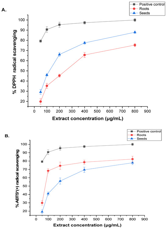 DPPH and ABTS estimation of (A) roots and (B) seeds of A. visnaga L. extracts. The presented statistics are mean values based on three replicates ± SD. * = radical cation.