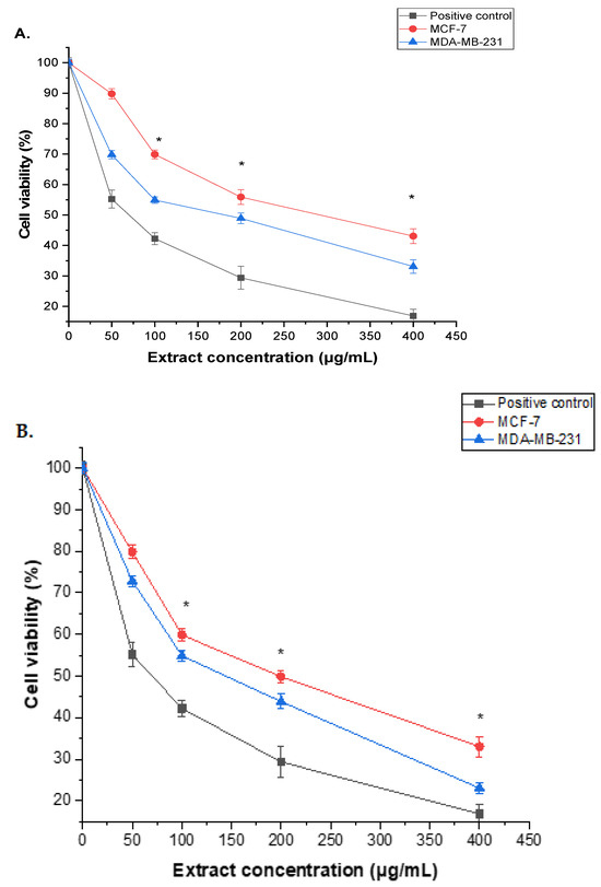 The cytotoxicity of A. visnaga L. extracts derived from roots (A) and seeds (B) was examined using the MTT assay for 24 h, with concentrations ranging from 0 to 400 μg/mL. The results, represented as the mean ± SD of three independent experiments, demonstrated a statistically significant difference from the control (* = p < 0.05). In particular, the cytotoxic effects of the extracts on MCF-7 and MDA-MB-231 cells were assessed.