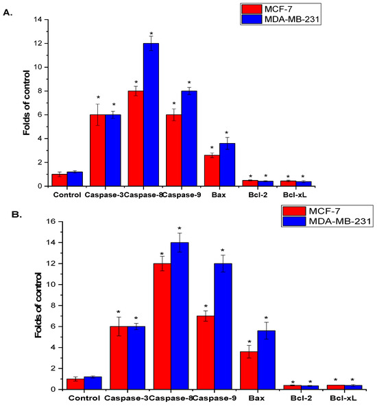 The effect of A. visnaga L. roots and seeds extract on apoptosis signaling in MCF-7 and MDA-MB-231 cells was assessed after 48 h using qPCR. As shown in Figure 4A,B, there was a significant increase in caspase-3, -8, and -9 mRNA levels in MCF-7 and MDA-MB-231 cells treated with roots and seeds extracts of A. visnaga L. compared to the control untreated cells. Furthermore, the extracts significantly upregulated Bax mRNA expression while significantly downregulating the anti-apoptotic genes Bcl-2 and Bcl-xL in treated MCF-7 and MDA-MB-231 cells, relative to the control untreated cells (p < 0.05). It is noteworthy that MDA-MB-231 cells treated with A. visnaga L. roots and seeds extracts exhibited greater sensitivity than MCF-7 cells.