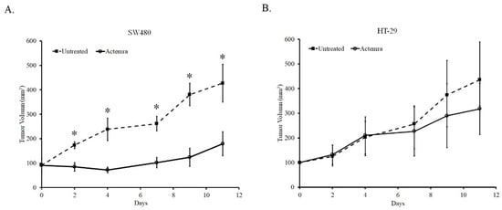 As shown in Figure 2, the tumor size of both untreated SW480 and HT-29 xenografts gradually grew from a volume of 100 mm3 to approximately 400 mm3 after 11 days. In the anti-IL-6R antibody (tocilizumab; ACTEMRA®, Rhoch Inc., San Francisco, CA, USA) treatment group, the tumor growth was inhibited only in the SW480 xenografts. The tumor was almost sustained at its original size after 7 days and had increased to approximately 160 mm3 at the end of the experiment. In contrast to the treated group of SW480, the tumors in the Actemra-treated HT-29 xenograft group showed similar growing potential to the untreated group after 7 days, despite having a slight decrease due to treatment at the end of the experiment. Although the average tumor volume in the treated-HT-29 group was lower than that in the untreated group, the difference between the groups was not statistically significant. The results showed the tumor response to anti-IL-6R antibody therapy was associated with the IL-6R expression levels in the human CRC xenografts.