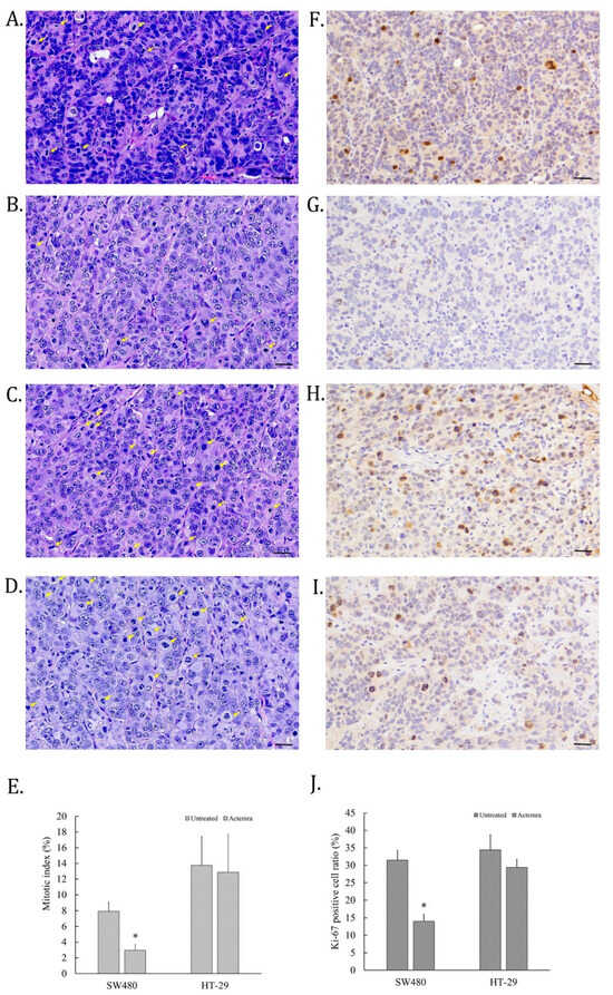 The mitotic index and Ki-67 expression in anti-IL-6R antibody treatment of human colorectal carcinoma SW480 and HT-29 xenografts. At the end of anti-IL-6R antibody treatment, tumors were processed into paraffin slices and then stained with H&E or anti-Ki-67 antibodies for immunohistochemical staining. The images were scanned using a micro scanner, as described in the Section 4. Representative H&E images of tumor tissues from the untreated SW480 (A), anti-IL-6R antibody (tocilizumab; ACTEMRA®)-treated SW480 (B), untreated HT-29 (C), and anti-IL-6R antibody-treated HT-29 (D) were captured (black bar as 30 μm long). The mitotic cells on the images are indicated by a yellow arrow and the mitotic index of each group is averaged from 10 different areas and is shown as means ± SEM; (E). Representative images of Ki-67 immunohistochemical staining of tumor tissue from the untreated SW480 (F), anti-IL-6R antibody-treated SW480 (G), untreated HT-29 (H), and anti-IL-6R antibody-treated HT-29 (I) were captured. The Ki-67 positive cells were calculated as a percentage of the total tumor cells in the tumor area of the image, shown as means ± SEM (J). * p < 0.05.