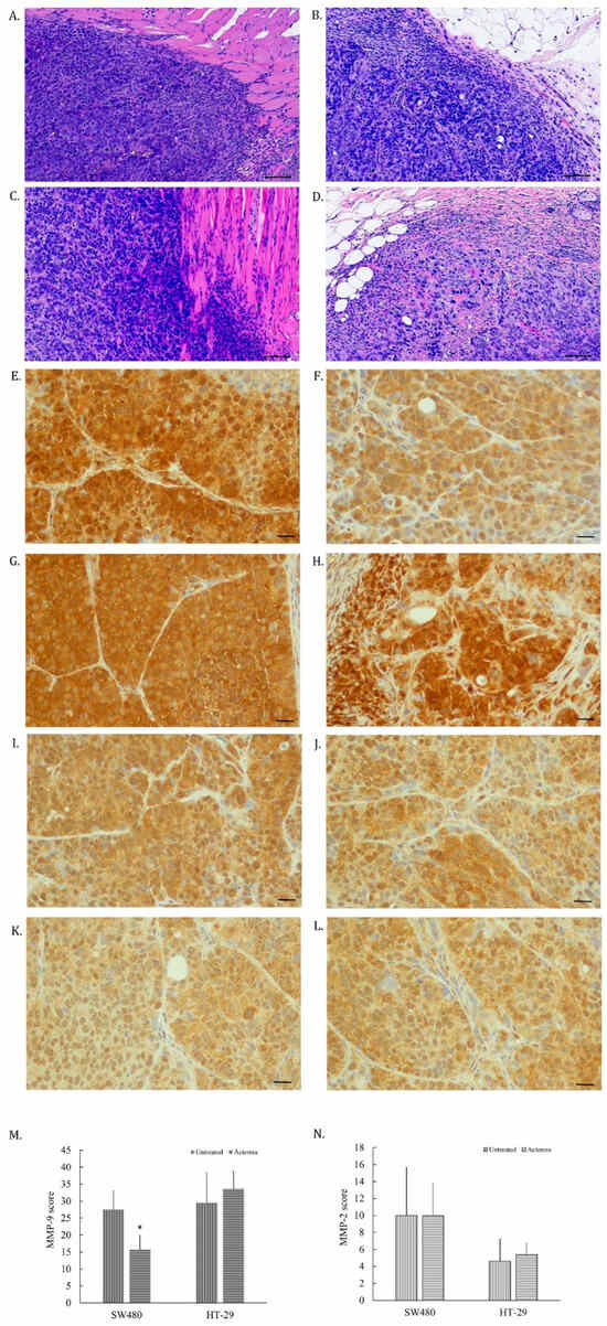 Invasiveness and MMP-9/-2 expression in anti-IL-6R antibody treatment of human colorectal carcinoma in SW480 and HT-29 xenografts. Tumor slices were stained with anti-MMP-9 or anti-MMP-2 antibodies via immunohistochemical staining and the images were scanned using a micro scanner, as described in the Section 4. The tumor invasiveness was first evaluated in the H&E staining slices and representative images showing the edges between tumor and normal tissue were captured (black bar is 60 μm long). The edges of the untreated SW480 tumors had rough, spiculated, and blurry boundaries, and some tumor cells had invaded into the muscle layer of the mouse abdomen (A). The edges of the anti-IL-6R antibody-treated SW480 tumors were surrounded by fibrotic tissue with smooth, round, and well-circumscribed boundaries. (B). As opposed to Figure 5B, the edges of both untreated (C) and tocilizumab (ACTEMRA®)-treated HT-29 tumors (D) were also rough, spiculated, and blurry, with invasion of infiltrating malignant cells into the muscle layer and fatty tissue of the mouse abdomen. Representative images of MMP-9 staining in tumor slices were captured from the untreated SW480 (E), anti-IL-6R antibody-treated SW480 (F), untreated HT-29 (G), and anti-IL-6R antibody-treated HT-29 (H) xenografts (black bar is 30 μm long). MMP-2 images were also captured from the untreated SW480 (I), anti-IL-6R antibody-treated SW480 (J), untreated HT-29 (K), and anti-IL-6R antibody-treated HT-29 (L) xenografts. The total score of MMP-9 from each group was averaged from 10 different areas and is shown as means ± SEM (M), and MMP-2 shown in (N). * p < 0.05.
