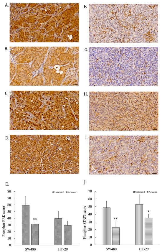 Signaling transduction in anti-IL-6R antibody treatment of human colorectal carcinoma SW480 and HT-29 xenografts. Tumor slices were stained with anti-phosphor-Erk-1/-2 and phosphor-STAT3 antibodies for immunohistochemical staining, and the images were scanned using a micro scanner, as described in the Section 4. Representative images of phosphor-Erk-1/-2 staining in tumor slices were captured from the untreated SW480 (A), anti-IL-6R antibody (tocilizumab; ACTEMRA®)-treated SW480 (B), untreated HT-29 (C), and Actemra-treated HT-29 (D) xenografts (black bar is 30 μm long). The total scores of phosphor-Erk-1/-2 from each group are averaged from 10 different areas and shown as means ± SEM (E). Phosphor-STAT3 images were also captured from the untreated SW480 (F), Actemra-treated SW480 (G), untreated HT-29 (H), and Actemra-treated HT-29 (I) xenografts. The total scores of phosphor-STAT3 from each group were averaged from 10 different areas and are shown as means ± SEM (J). * p < 0.05 and ** p < 0.01.
