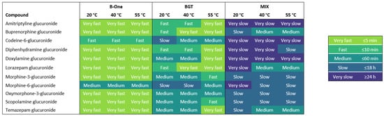 Generally, B-One showed the best overall hydrolysis efficiency of most glucuronides, reaching ≥90% cleavage within 5 min (Figure 1). The hydrolysis of morphine-6-glucuronide and codeine-6-glucuronide was slightly longer than the rest of the analytes, occurring in 10 min and 60 min, respectively. BGT showed a similar efficiency to B-One, but glucuronide cleavage was faster at 55 °C for most analytes (Figure 1). The hydrolysis was least efficient for codeine-6-glucuronide and morphine-6-glucuronide with 90% cleavage being reached within 18 h at 20 °C. However, the efficiency improved to ≥90% cleavage within ≤60 min when increasing incubation temperature to 40 °C and 55 °C. Thus, BGT showed fast (5–60 min) and efficient hydrolysis, but the optimal temperature and incubation time was more analyte-specific, which was also noted in the manufacturer instructions. The MIX enzyme showed the lowest overall hydrolysis efficiency (Figure 1). With this enzymatic treatment, an incubation time of either 18 h or more than 24 h was needed to reach 90% cleavage for most glucuronides. The hydrolysis was least efficient for amitriptyline glucuronide, codeine-6-glucuronide and doxylamine glucuronide at all temperatures. Furthermore, the enzyme was most efficient at hydrolyzing buprenorphine glucuronide, lorazepam glucuronide and temazepam glucuronide at 40 °C and 55 °C. It should be noted that the estimated efficiency does not take possible enzyme breakdown into consideration. Thus, it is plausible that incubation for 24 h at 55 °C could affect an enzyme like MIX, which has optimal conditions at 37–40 °C.