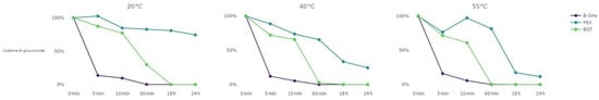 Cleavage (%) of codeine-6-glucuronide when enzymatically hydrolyzed with either MIX, B-One or BGT at 20 °C, 40 °C and 55 °C for 24 h. The x-axis is in categorical order based on the five incubation periods.