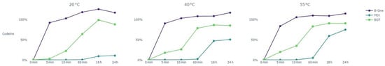 Analyte recovery (%) for codeine when its corresponding glucuronide is enzymatically hydrolyzed with either MIX, B-One or BGT at 20 °C, 40 °C and 55 °C for 24 h. The x-axis is in categorical order based on the five incubation periods.