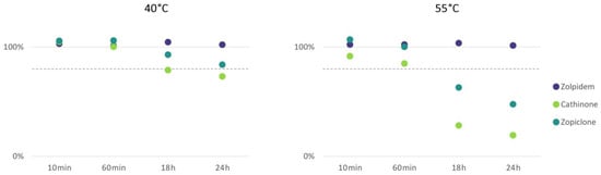 Average decrease (%) of cathinone and zopiclone peak area during incubation at 40 °C and 55 °C for 24 h. Zolpidem is shown as an example of 1 of the 139 DFSA-relevant drugs where stability was not affected. The dotted line represents the −20% limit. Each experiment was performed in duplicate.