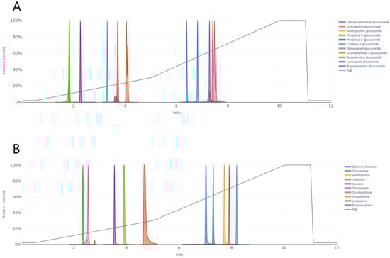 Sample analysis was performed on a Waters ACQUITY UPLC system coupled to an Xevo TQS tandem mass spectrometer (Waters, Milford, MA, USA). Analyte separation was performed on an ACQUITY UPLC HSS T3 column (100 × 2.1 mm, 1.8 µm) at 45 °C. The mobile phase consisted of A) 1 mM ammonium formate in 0.1% FA and B) 0.1% FA in methanol and acetonitrile (1:1). The flow rate was 0.40 mL/min, and the gradient was 2% B (0–5 min), 30% B (5–10 min), 100% B (10–11.1 min) and 2% B (11.1–12 min). The autosampler temperature was 10 °C to ensure analyte stability and the injection volume was 0.4 µL. All glucuronides and their parent drugs eluted within 9 min (Figure 5).