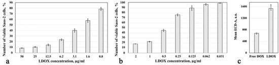 Cytotoxicity IC50 for LDOX in the Saos-2 cell line after 48 h (a) and 72 h (b) of incubation. Drug accumulation (c). *, statistically significant difference from the free DOX, p < 0.05.