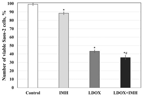 Cell viability of the Saos-2 cells exposed to the combination treatments with LDOX and IMH. *, statistically significant difference from the control, p < 0.05; #, statistically significant difference from the IMH treatment, p < 0.05.