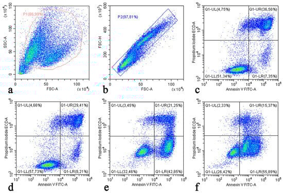 Figure 3 demonstrates the typical dot plots for the Saos-2 cells acquired from annexin V and propidium iodide flow cytometry studies. The cells were gated such that the cellular debris on the forward scatter area (FSC-A)/ side scatter area (SSC-A) dot plot (Figure 3a) and the cell doublets based on the FSC-A/ forward scatter height (FSC-H) plot (Figure 3b) were excluded. An analysis of the apoptosis and necrosis parameters was then performed using a four-quadrant gate on the fluorescein isothiocyanate area (FITC-A)/ energy-coupled dye area (ECD-A) plot in accordance with the annexin V and propidium iodide staining properties (Figure 3c–f).