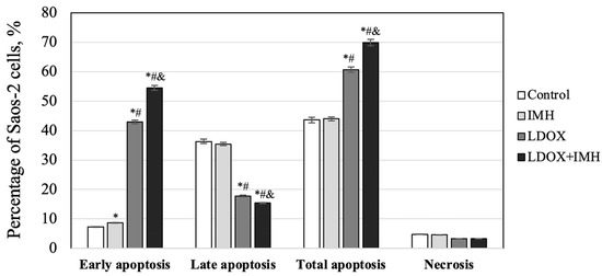 Flow cytometric analysis of apoptosis and necrosis in the Saos-2 cells. *, statistically significant difference from the control, p < 0.05; #, statistically significant difference from the IMH treatment, p < 0.05; &, statistically significant difference from the LDOX treatment, p < 0.05.