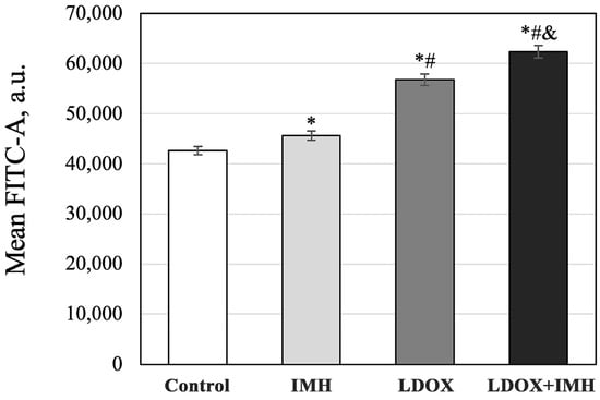 Flow cytometric analysis of ROS production levels in the Saos-2 cells. *, statistically significant difference from the control, p < 0.05; #, statistically significant difference from the IMH treatment, p < 0.05; &, statistically significant difference from the LDOX treatment, p < 0.05.