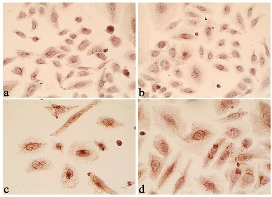 The Saos-2 cells were incubated for 72 h under standard conditions in the control (no treatment) and the IMH, LDOX, or LDOX plus IMH groups and then fixed with a methanol solution (Sigma-Aldrich, USA) and acetone (Chimreserv, Kyiv, Ukraine). The cells were subsequently probed with primary antibodies to Bax (clone 6A7, Thermo Scientific, Waltham, MA, USA), which recognize an epitope of the activated protein form [94,95], and incubated at room temperature for 1 h. An immunocytochemistry assay provided an integral visualization of the Bax expression in the cells. Immunolabeling was detected using a SuperPicture Polymer Detection Kit (Thermo Fisher Scientific, USA) with a hematoxylin counterstain for 2 min. Bax protein expression was assessed by an H-score [96].