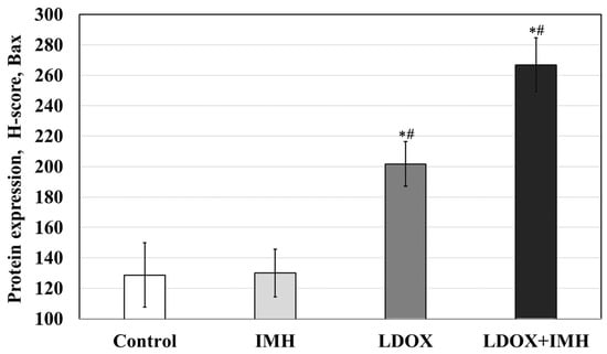 To investigate the molecular mechanisms that govern the susceptibility of Saos-2 cells to LDOX-induced apoptosis in response to IMH, we examined the pro-apoptotic Bax protein expression levels (Figure 6 and Figure 7). This protein is involved in the regulation of chemotherapy resistance [52]. The LDOX and LDOX plus IMH treatments caused 57% and 107% increases in Bax expression, respectively, compared with the untreated Saos-2 cells in the control group (p < 0.05). However, there was no significant difference in the Bax level between the control and the IMH treatment.