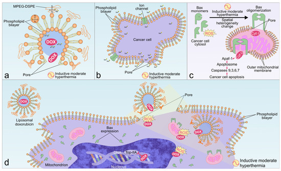 Schematic illustration of the proposed mechanism of the LDOX plus IMH action in cancer cells. (a) LDOX consists of an aqueous core with DOX hydrochloride enclosed within a phospholipid bilayer coated with MPEG-DSPE. IMH triggers the release of DOX by reorganization of the phospholipid bilayer and pore formation due to changes in the charge distribution directed by the electromagnetic fields. (b) IMH affects electron and ion transport across cell membranes through electroporation, electromechanical deformation, and moderate temperature increases, resulting in pore formation and increased DOX uptake. (c) Redistribution of the charges and ROS generation driven by IMH changes the spatial heterogeneity of the pro-apoptotic Bax protein in the cells, facilitating oligomerization and pore formation in the outer mitochondrial membrane. If Cyt c was released to the cell cytosol, its interaction with Apaf-1 could activate caspases 9, 3, 6, and 7 to initiate apoptosis. (d) IMH improves LDOX delivery through the enhanced permeability of the phospholipid bilayers driven by the induction of the eddy currents and moderate temperature rise. Once delivered to the cancer cells, DOX causes damage by ROS production, DNA intercalation, and Top-IIA inhibition, while IMH further increases ROS levels and changes the spatial heterogeneity of Bax, leading to apoptosis.