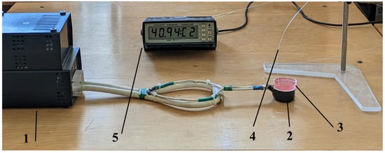 Experimental setup for the in vitro assessment of the combination treatment with LDOX and IMH in the Saos-2 cell line: the MagTherm device (1) equipped with an applicator composed of a loop and ferromagnetic dipoles (2) [83], a Petri dish with the Saos-2 cells and medium (3), a fiber optic sensor (4), and a digital thermometer (5).