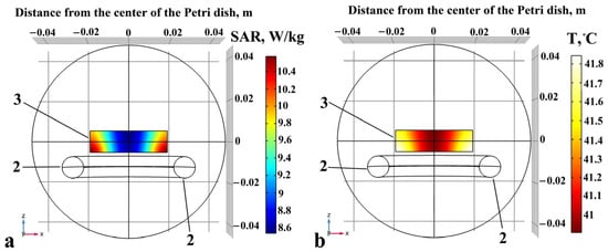 Computer-assisted planning of the SAR (a) and temperature (b) distributions produced by IMH in the cancer cells. The applicator (2) and Petri dish with the cells and the medium (3).