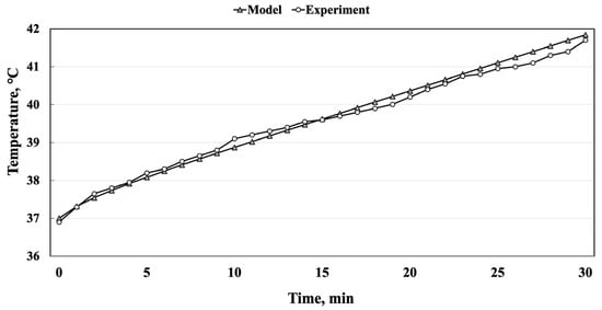 Comparison between the simulation and the experimentally measured values of the temperature over the 30 min of exposure of the Saos-2 cells to IMH (R2 = 0.997).