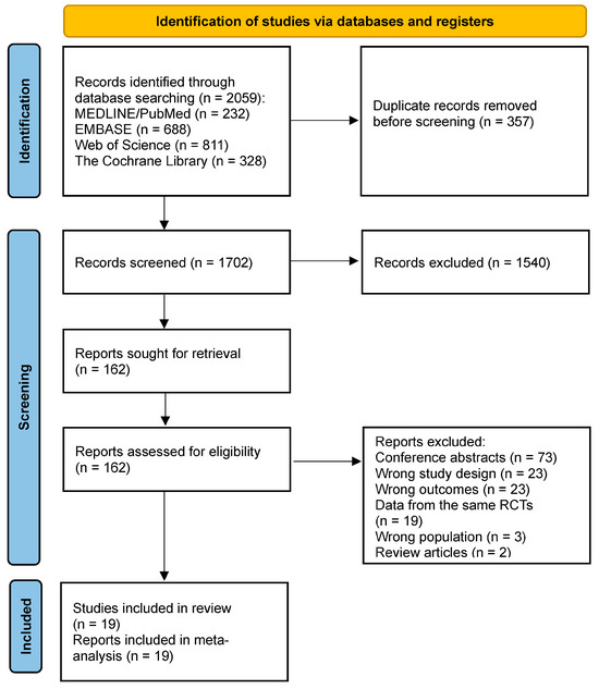 The initial reference search yielded 2059 articles. Of these, 357 duplicates were removed and the remaining 1702 abstracts were screened. This produced 162 papers suitable for a full-text review. Reference screening of those studies did not provide additional records that met eligibility criteria. After full-text screening, 19 studies were subjected to extraction and quantitative synthesis (meta-analysis). The PRISMA study flow-chart outlining the study inclusion process is illustrated in Figure 1 [9]. The risk of bias assessment is presented in Table S3. In general, studies had high quality, although some studies were rated as having some concerns due to the lack of information about whether the outcome assessors were masked to the treatments when adjudicating cancer events.